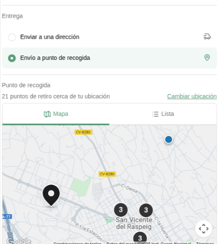 Durante el proceso de compra, selecciona “Enviar a punto de recogida” e introduce el Código Postal 03690.