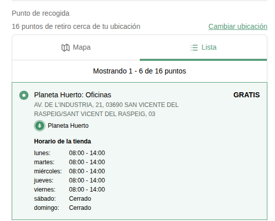 Planeta Huerto no tiene tienda física abierta al público como tal, pero sí ofrece la opción de recoger tu pedido directamente en sus instalaciones en Sant Vicent del Raspeig (Alicante)